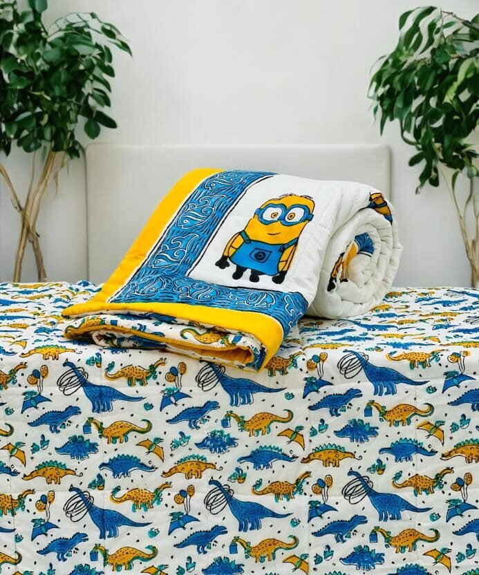 The quilt features charming printed handblock designs on both sides, making it fully reversible and giving two adorable looks in one product. Carefully hand-stitched by skilled artisans, it ensures durability while maintaining a lightweight and cozy feel—perfect for everyday use.